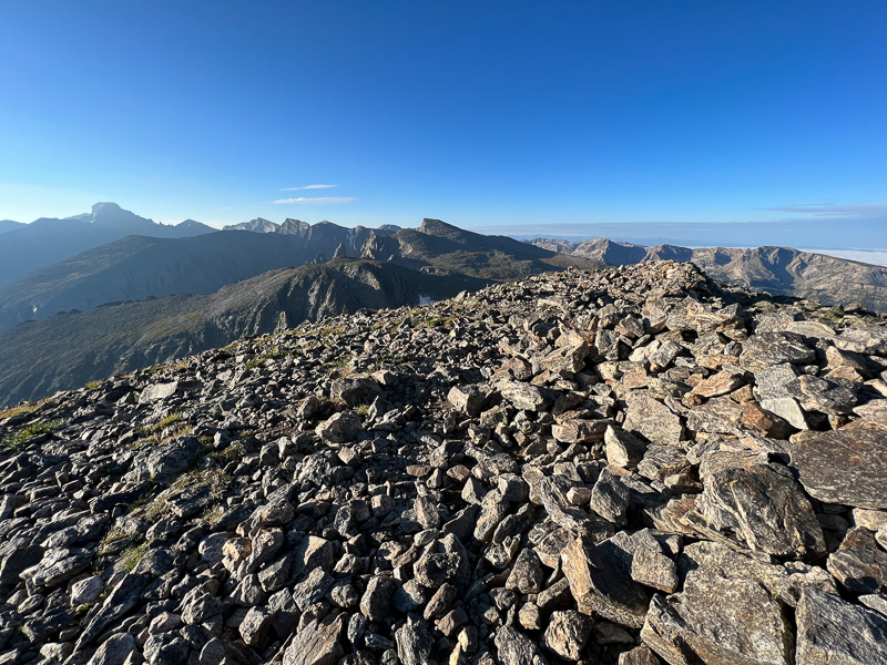 Without incident I was soon topping out on the summit of Hallett Peak (12,713 feet). This is one of the best summits in the entire national park for a few reasons. One, it’s one of those aesthetic summits that feels like you’re standing on top of a real mountain! The summit cone gets you up above all of the surrounding terrain and the views are stunning in every direction. Two, it’s relatively easy to get to. A well established trail takes you up to the “summit” of Flattop Mountain, and an easy to follow social trail takes you from there right to Hallett’s summit, about .6 mile away. Finally, it’s just cool to stand up on the summit that dominates the views in the Bear Lake corridor and Tyndall Gorge.