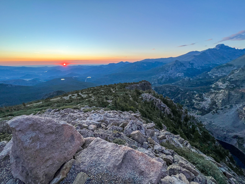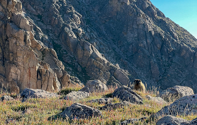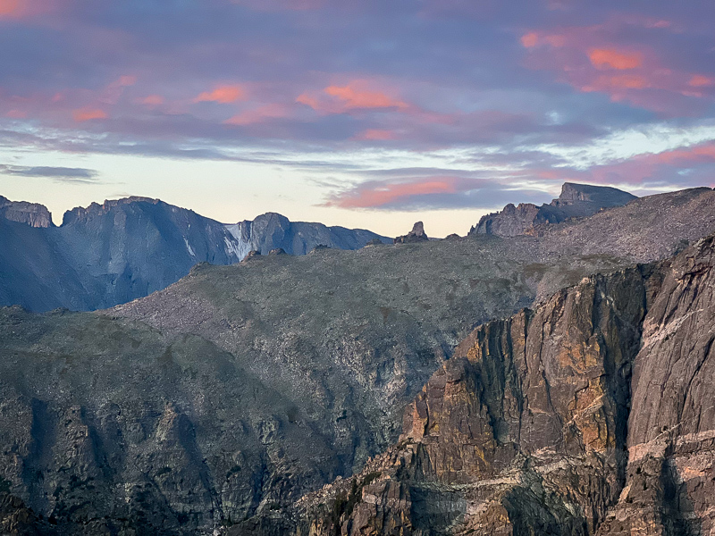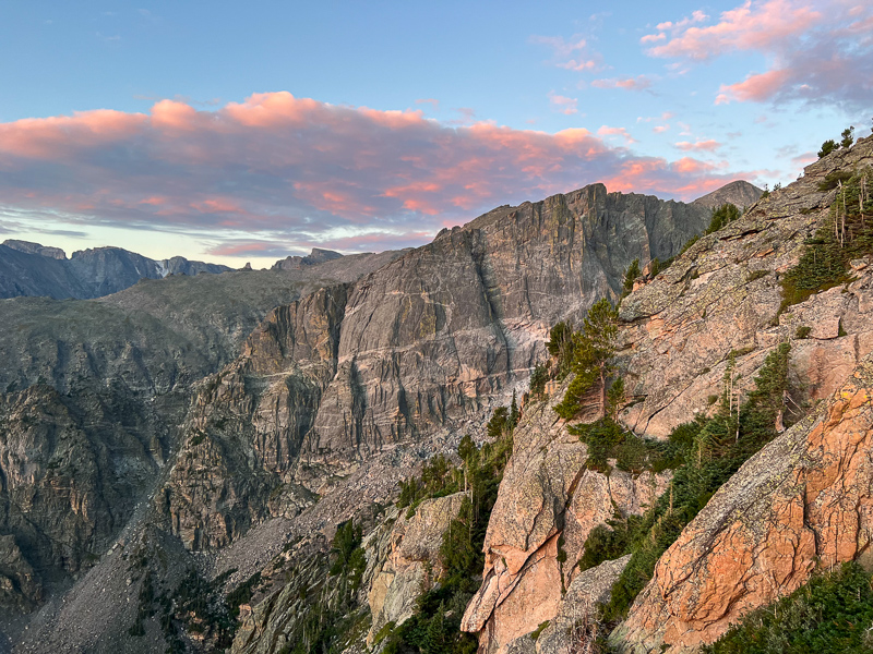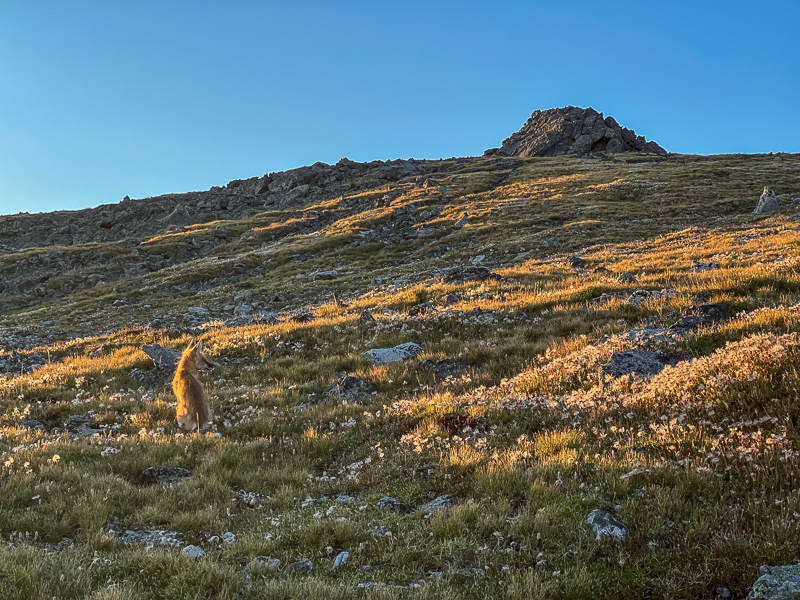 I took it easy and just let the headlamp lead the way until sunrise right at the Emerald Lake overlook. I spent some time enjoying the alpenglow on the high peaks and the soft clouds above before making my way higher above tree line. Some pikas greeted me and made for some fun viewing and a good excuse to stop hiking for a few minutes to catch my breath. I took a few pictures and some video, then began making my way up the trail when a fox exploded in a run right at my feet! It had been sleeping right on the trail and I stepped about two feet from it, giving both of us a good scare!