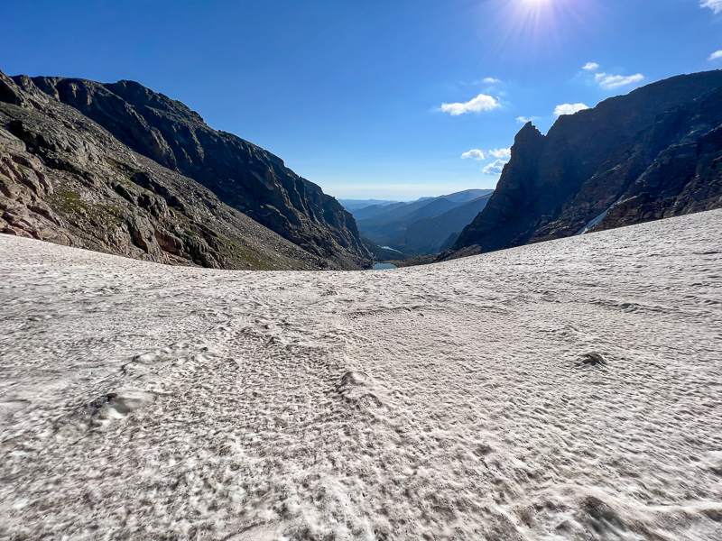 I slid and skated down to Andrew’s Tarn, took off the spikes and worked myself down the steep trail toward the trail leading back to The Loch and the trail head. At this point I started running into the masses of people. Prior to getting back on the main trail I had just seen four people since I started. It was slower going weaving through the traffic on the trail, but before long I was below The Loch and heading over toward Haiyaha on the unimproved trail.