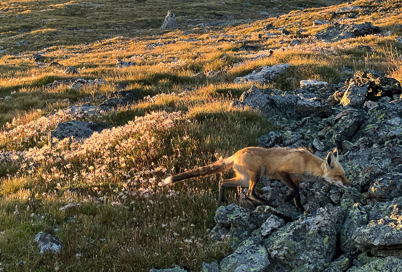 I hung out with this beautiful female fox for about 20 minutes watching it meticulously hunt pikas in the rocks on the tundra. It didn’t really care that I was there and was a true joy to get to spend some time with this gorgeous animal. After a bit I figured I had better continue on and let the vixen continue her hunt without me. I’m sure she fared better when I moved along.